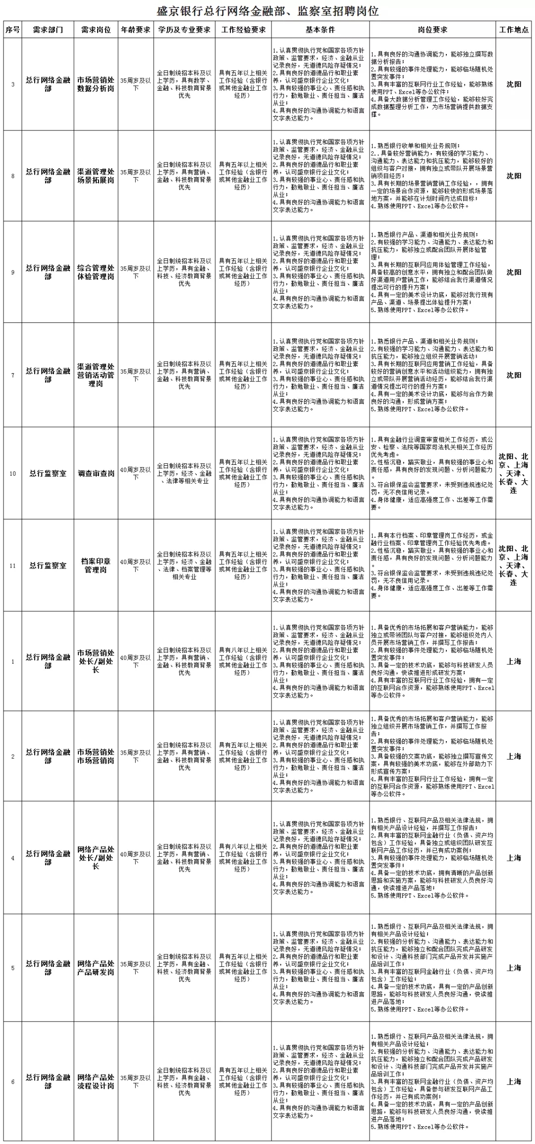 附表:盛京银行总行网络金融部、监察室招聘岗位(见下图)