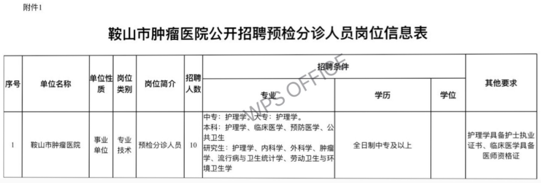 面向社会招聘鞍山市肿瘤医院预检分诊工作人员,共计10人。