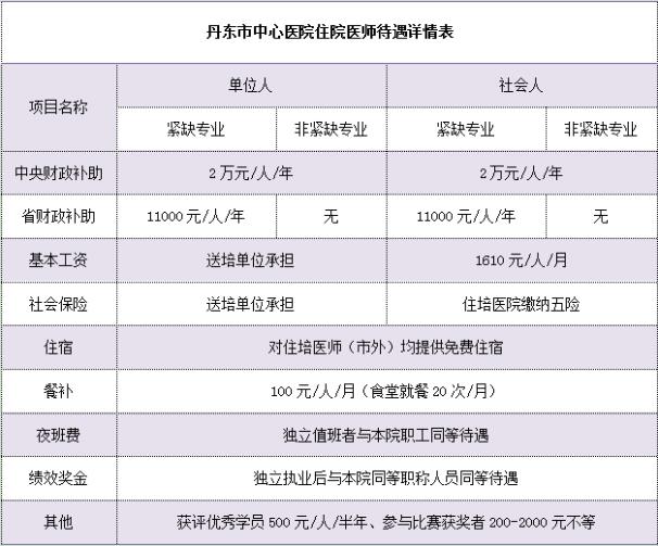 (2)医院为学员培训提供多方面保障,包括国家、省、医院、科室补助、夜班费等,且与面向社会招收学员签署劳动派遣合同,缴纳五险,待遇详见下表。