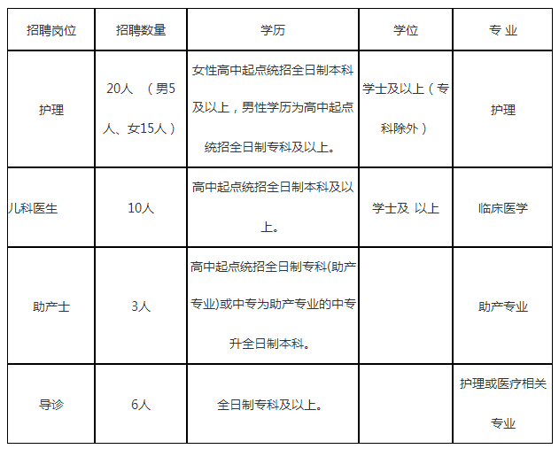 6.儿科医生岗位:2017年(含)以后毕业生,高中起点统招全日制本科及以上学历,需具有医师资格证和医师执业证(2020年和2021年毕业生除外)。