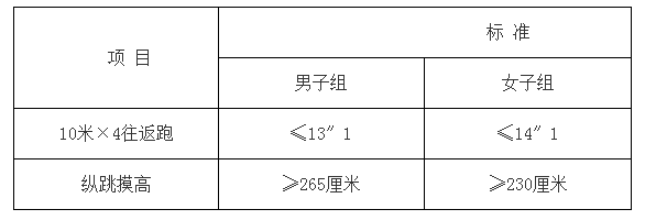 测试方法为:准备测试阶段,受测者双脚自然分开,呈站立姿势。接到指令后,受测者屈腿半蹲,双臂尽力后摆,然后向前上方快速摆臂,双腿同时发力,尽力垂直向上起跳,同时单手举起触摸固定的高度线或高度标识,触摸到高度线或者高度标识的视为合格。测试不超过三次。