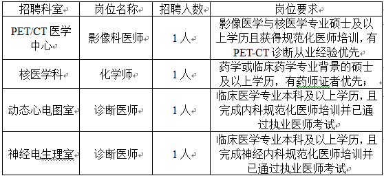 4. 考核:考核工作分为面试和用人科室试工(1-2周)两部分。面试及试工所需交通费及住宿费自理。考核时间、地点等信息,我院将电话另行通知。