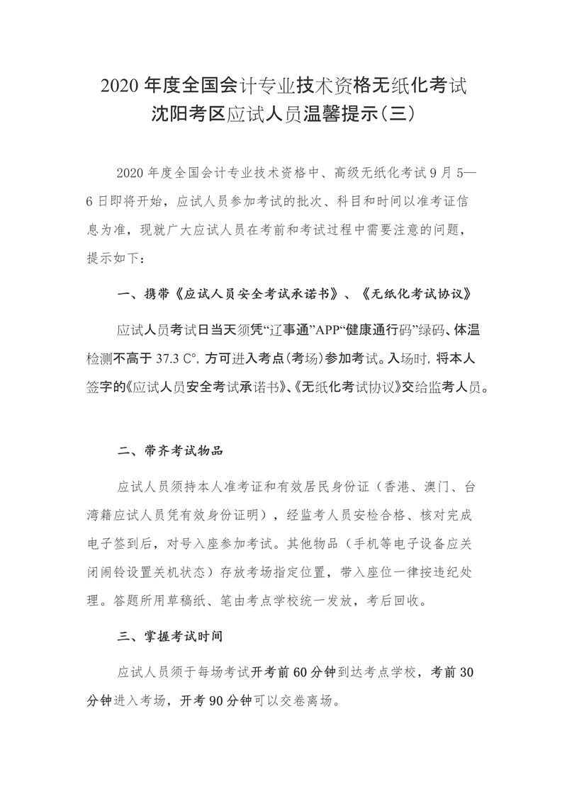 2020全国会计专业技术资格无纸化考试 沈阳考区应试人员温馨提示